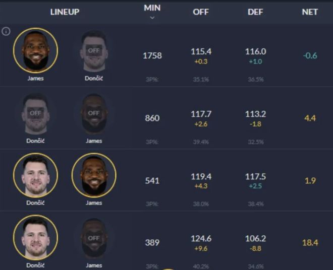 可是当东契奇在场,詹姆斯不在场,这样的情况一共出现了389分钟,湖人队百回合进攻效率124.6,百回合防守效率106.2,攻防两端都有明显提升,净胜分居然高达18.4。